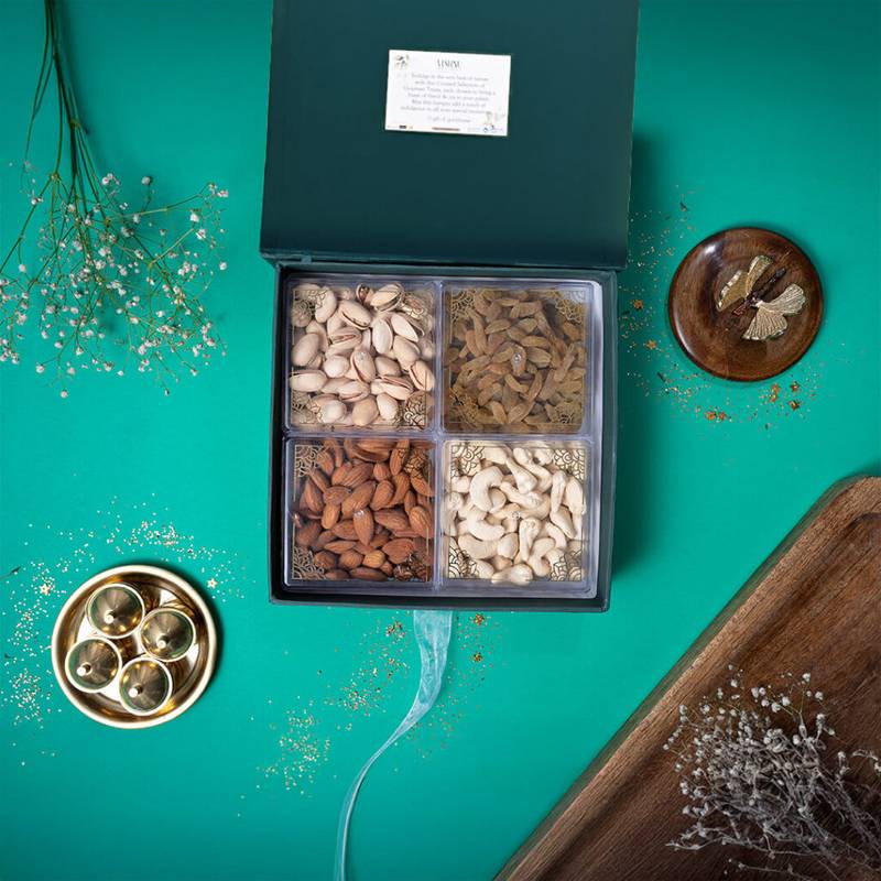 - Wholesome & Festive Delight – A balance of taste and health, combining crunchy snacks, dry fruits, and sweet chocolates – perfect for festive gifting.